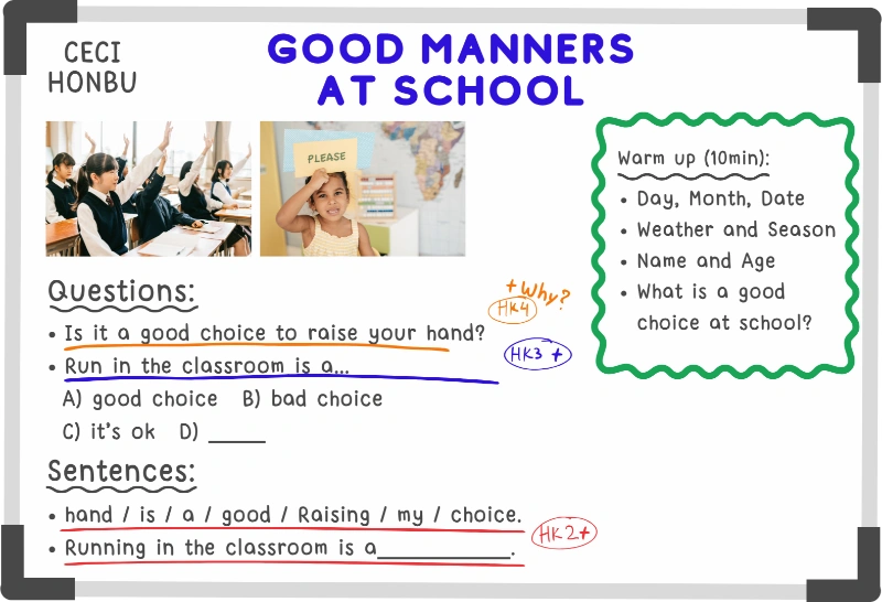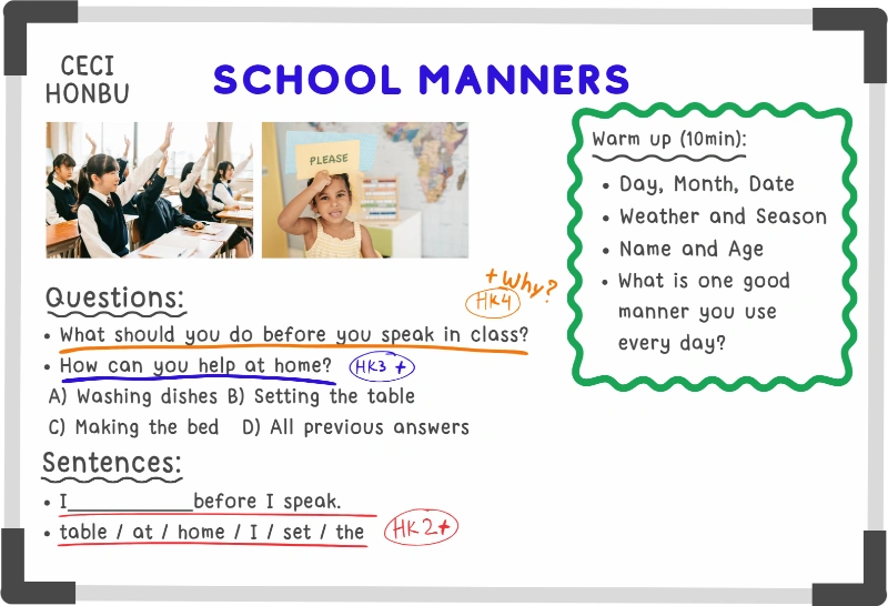 This month, students will learn about school manners and daily responsibilities. They will practice polite expressions, understand classroom rules, and explore ways to behave respectfully with teachers and friends. Through games, movement activities, and crafts, students will also learn about helping at school and at home. The goal is to build good habits and make positive choices in everyday situations.